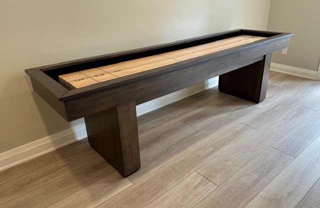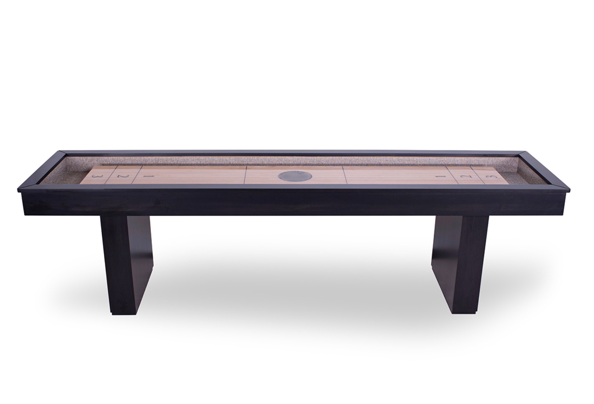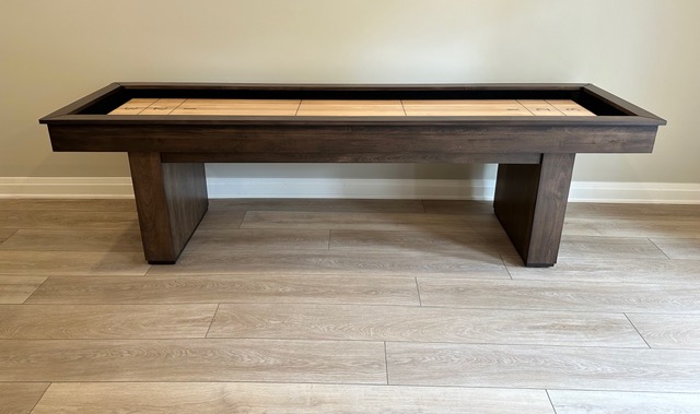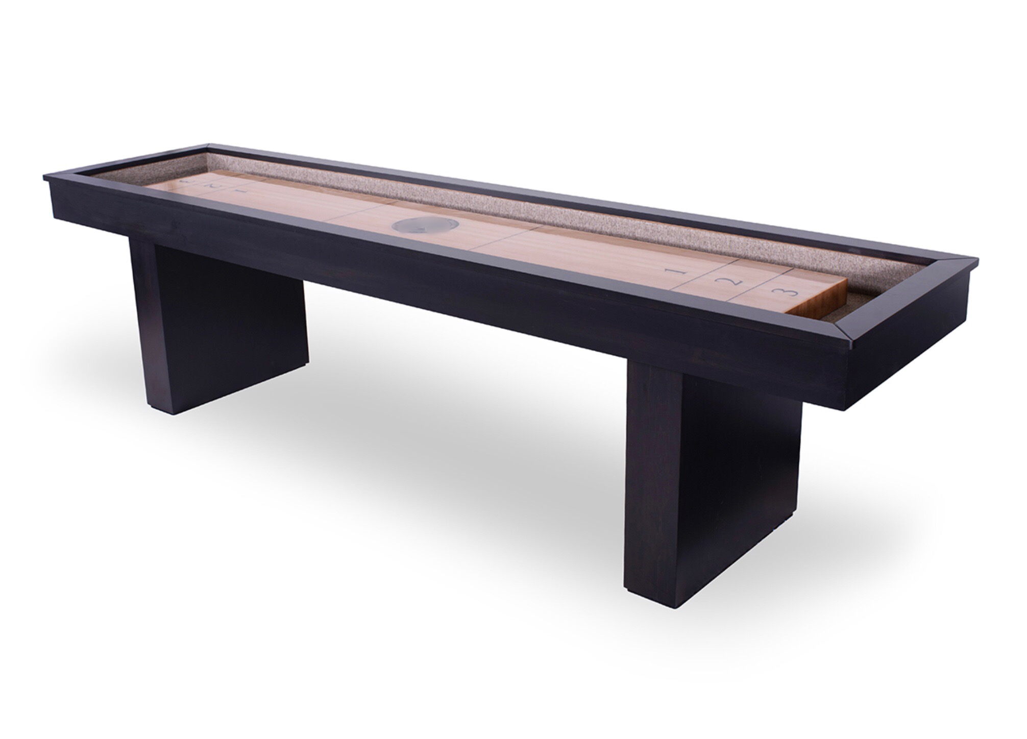 The New Yorker Shuffleboard is a deceptively simple design that allows it to pair and blend with many pool table models in our standard collection. The New Yorker shuffleboard currently comes standard in a 9′ 16″ wide board and may be upgraded to a 12’ or 14’ board with a 20” wide playing surface. The image below is Solid Maple with Coal Finish. You can also choose your own finish colour, as all our products are made to order.